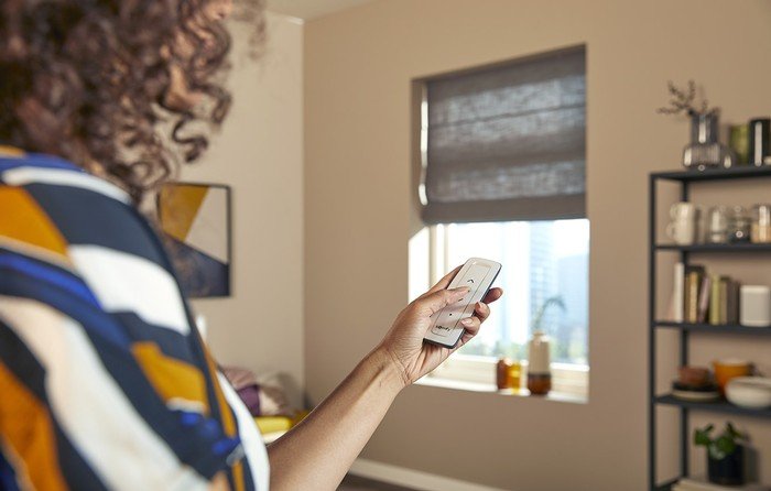 As Persianas Motorizadas Somfy não têm fio e podem ser abertas ou fechadas por controle remoto, aplicativo de smartphone ou comandos de voz, o que os torna ideais para janelas altas e de difícil acesso. Se você tem filhos ou animais de estimação em casa, usar coberturas de janelas motorizadas sem fio oferece segurança adicional para aqueles que você ama.